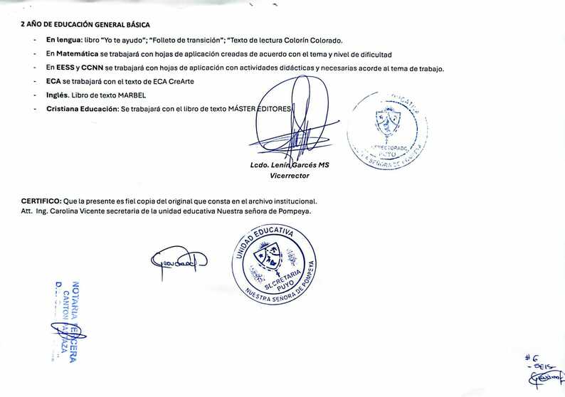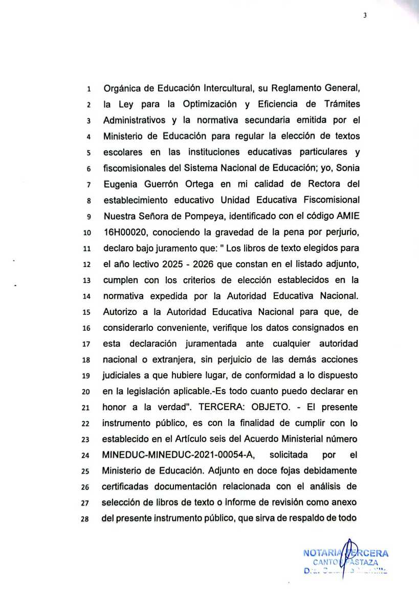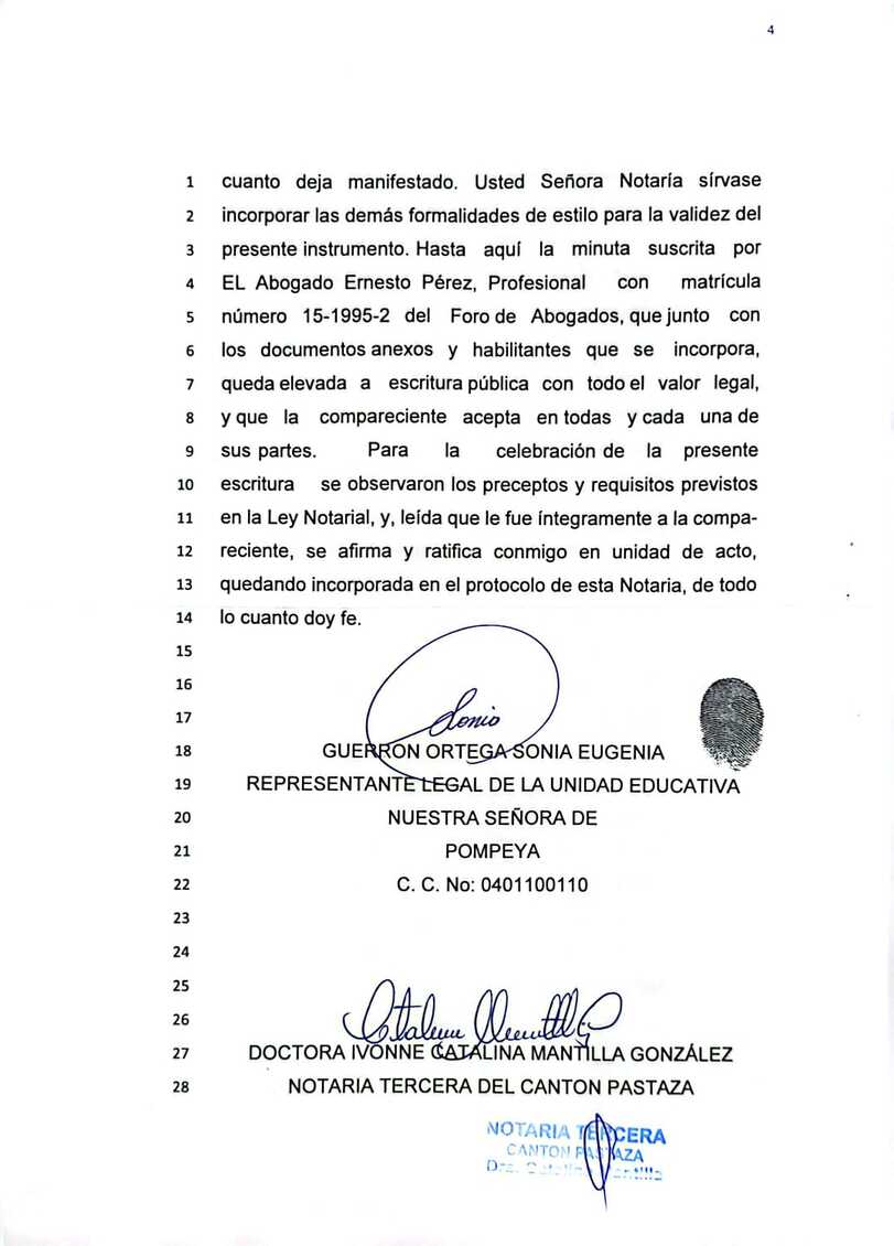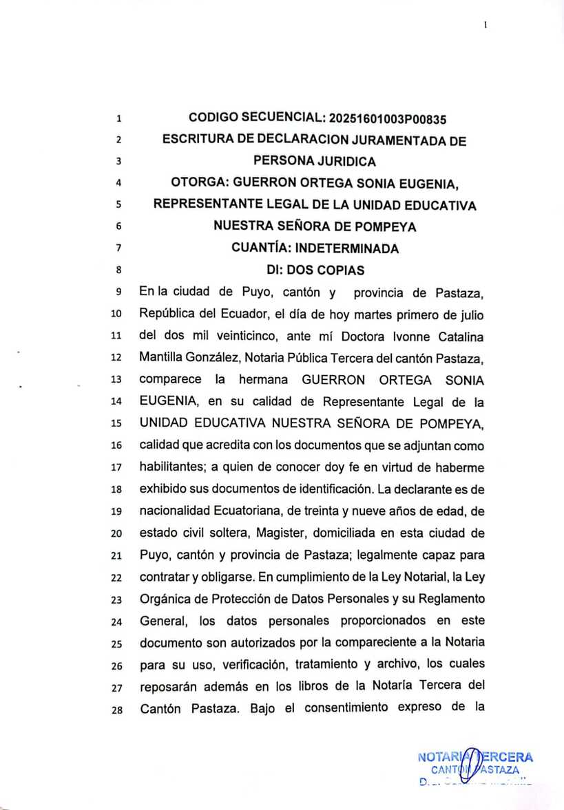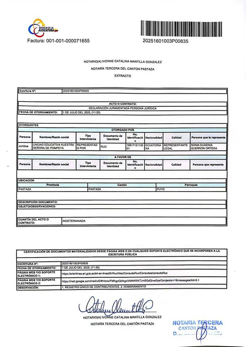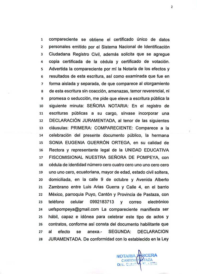 En el 2010 el DISTRITO EDUCATIVO INTERCULTURAL Y BILINGÜE 16D01 PASTAZA MERA SANTA CLARA, mediante la resolución - 005-12 DEIBP RESUELVE transformar el Colegio Nuestra Señora de Pompeya en UNIDAD EDUCATIVA FISCOMISIONAL NUESTRA SEÑORA DE POMPEYA, mediante la integración técnica, pedagógica y administrativa con el centro educativo de EDUCACIÓN BÁSICA, Sto. Domingo de Guzmán de la ciudad de Puyo, Cantón y provincia de Pastaza, a partir del año lectivo 2010-2011.
