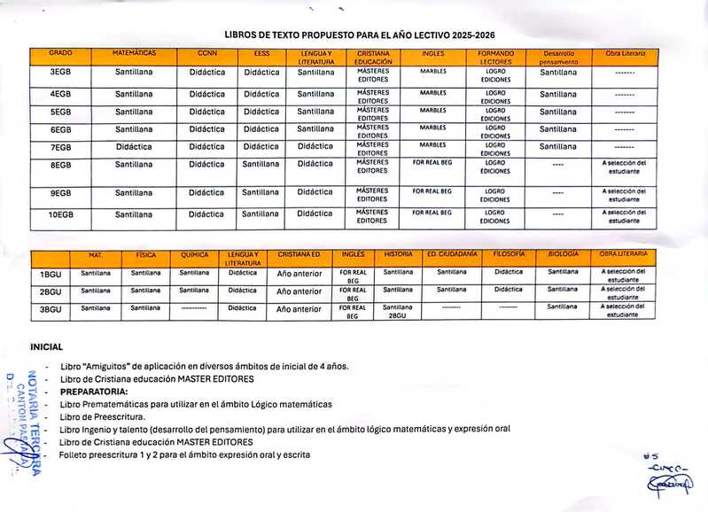 Los horarios son de Lunes a Viernes. Los estudiantes se rigen en el horario de 07H00 a 12H 20 para Educación Inicial, Educación Básica Elemental, Educación Básica Media y Educación Básica Superior. De 07H00 a 13H00 Bachillerato General Unificado y de 07H00 a 13H45 Bachillerato Técnico